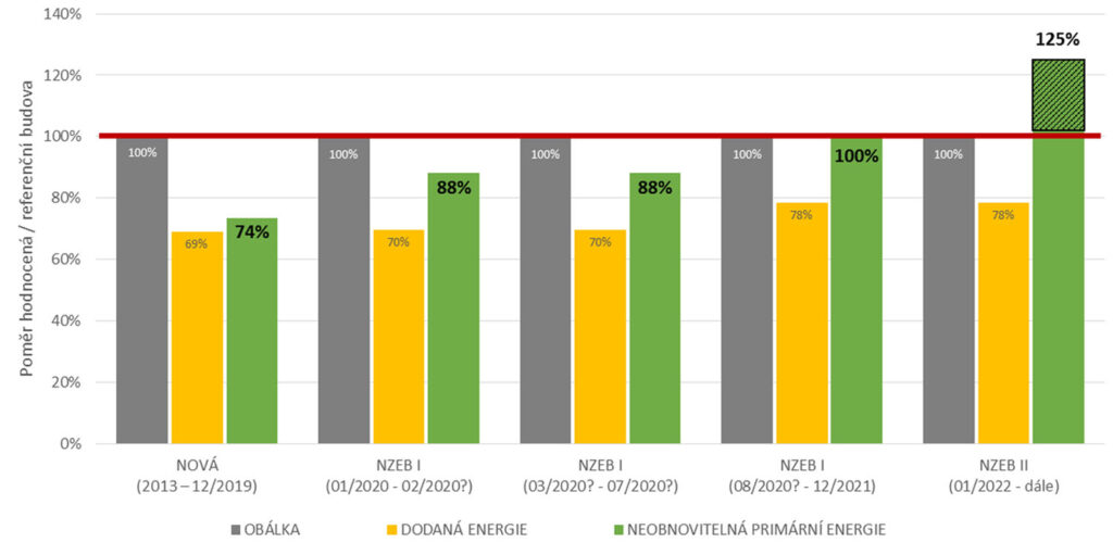 V oblasti nZEB se úpravou požadavků navázaných na měrnou potřebu tepla na vytápění referenční budovy zapojila v oblasti rezidenčních budov do energeticky úsporných opatření i energetická náročnost architektonického konceptu. Rozlehlé a členité budovy s energeticky nevhodnou orientací musí svůj „energetický handicap“ dohnat realizací úspornějších technologií, což se projeví zvýšením nákladů na výstavbu.