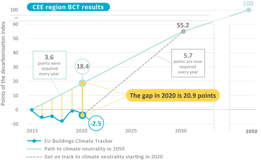 Analýza pro země střední a východní Evropy ukazuje ještě znepokojivější trend: do roku 2020 je pokrok v dekarbonizaci fondu budov o 21 bodů mimo míru požadované dekarbonizace, což je největší rozdíl od začátku sledovaného období v roce 2015. Proto je v regionu střední a východní Evropy zapotřebí každoročně dosáhnout pokroku v dekarbonizaci o 5,7 bodu, aby se do roku 2030 dostal na správnou cestu.