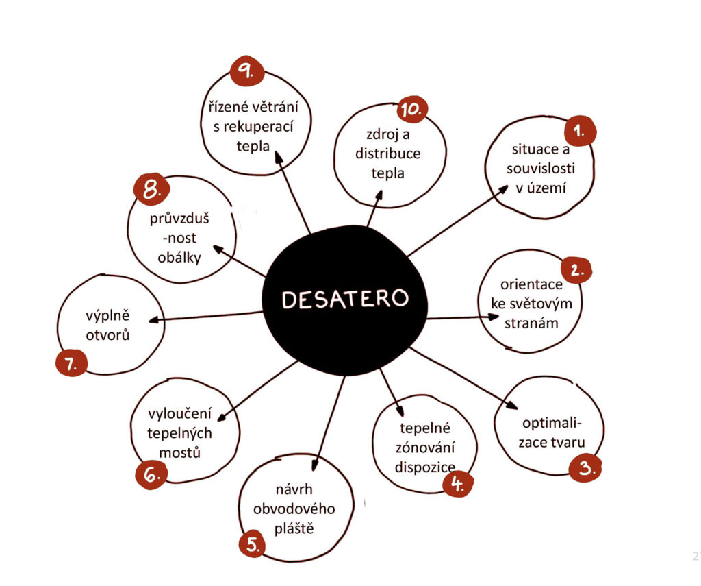 Radu ohledně nejlépe investovaných peněz do výstavby domu můžeme shrnout do dvou poznatků: nejdražší na stavbě domu je zbytečně obestavěný kubík a nejlevnější energie do budoucna je ta, kterou stavebník nebude potřebovat a za kterou mu nepřijde faktura. Za tímto účelem jsme rozvinuli deset kroků takzvaného „desatera“. Využije-li architekt či projektant alespoň 6 bodů z desatera, splní požadavky na nZEB II. První čtyři body jsou víceméně beznákladové a zodpovídá za ně nejčastěji architekt. Rozhodne-li se je nevyužít, bude muset investor důsledně optimalizovat zbývajících 6 bodů, které již představují vícenáklady. Využití 9–10 bodů desatera jej dovede k výstavbě pasivního domu. Protože lze bezemisní budovy chápat jako pasivní domy s menší fotovoltaickou elektrárnou, docílíme tohoto standardu při splnění všech 10 bodů. Každý stavebník by se měl proto řídit deseti posloupnými kroky a měl by se zamyslet nad následujícími body: