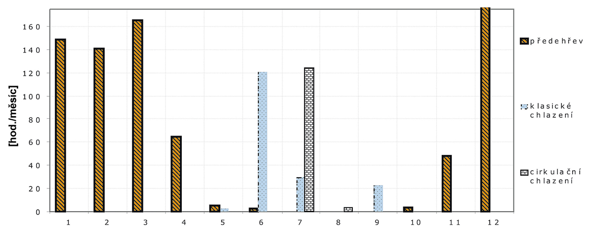 Rovnotlaké větrací jednotky mají u standardních realizací max. výkon přívodního (a zároveň odváděného) vzduchu do cca 300 m3/h. Při průchodu zemí je ochlazen vzduch např. z venkovních 32 °C na 17 °C, při průtoku 300 m3/h je tedy chladicí výkon pouze ZVT 1,5 kW. Pro interiér ale máme rozdíl teplot jiný – přívodní vzduch teoreticky cca 17 °C, teplota interiéru 25 °C – rozdíl teploty cca 8 °C. Celkový chladicí výkon systému je pak díky těmto podmínkám kolem 1 kW. Tato hodnota je snížena skutečností, že vzduch prochází přes ventilátor, který se chladí a svým příkonem protékající vzduch ohřívá. Teplovzdušné jednotky s dvouzónovou koncepcí umožňují přívod vzduchu až v řádu 1000 m3/h, chladicí výkon do interiéru je pak na úrovni maximálně 2,5–2,8 kW. V EPD Rychnov máme k dispozici průtok vzduchu 400 m3/h, dle měření se chladicí výkon pohybuje v rozsahu 1,3–1,8 kW, za den pak dodává 15–28 kWh chladu do interiéru. V grafu 3 je pro informaci provozní využitý ZVT (nebo ZVT-c) v hodinách za měsíc roku 2006.