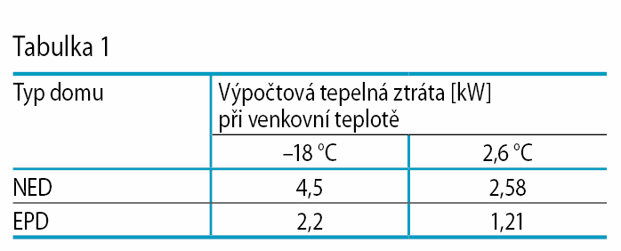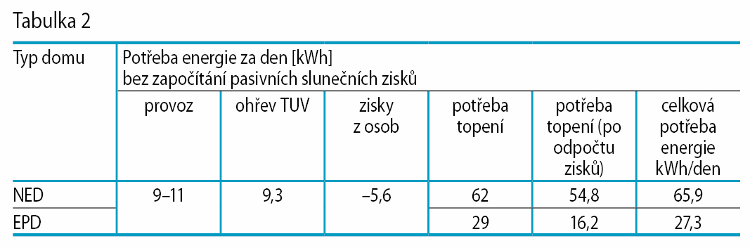 V tabulce 1 je porovnání teoretické potřeby energie v objektu velikosti objektu v Rychnově v provedení NED a EPD parametrů. Toto porovnání bylo provedeno pro teplotně průměrný zimní den, ve kterém sluníčko ani nezasvítí. To proto, aby porovnání nebylo ovlivněno pasivními slunečními zisky. Výrazný rozdíl nastává v době zabydlování objektu. Pokud je dům stavebně dokončen např. začátkem prosince a začne se zvedat teplota interiéru ze stavební teploty cca 12 °C na požadovanou teplotu interiéru 22 °C, je potřeba dodat velké množství energie na prohřátí konstrukcí. U zděného objektu se jedná o desítky až stovky tun materiálu. Denní spotřeba pak může být i čtyřikrát vyšší než údaj v tabulce 2.