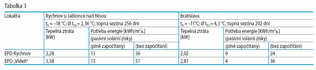 Dle našich zkušeností jsme chtěli udělat alespoň porovnání výpočtové. Protože metody výpočtu v ČR a Rakousku jsou rozdílné (PHPP nemá česká klimatická data a v Rakousku se nám nepodařilo získat hodnoty odpovídající ČSN, alt. STN), vybrali jsme pro porovnání s EPD Rychnov jeden dům u Vídně, kde se nám podařilo získat podrobné technické údaje. Z 60 % prosklená jižní fasáda, pultová střecha, dvě patra – prostě koncept budovy, který je v ČR často prezentován jako jediný možný pro realizaci EPD. Umístili jsme jej do Rychnova u Jablonce a do Bratislavy. V tabulce 3 je vidět shrnutí, ze kterého je patrný vliv pasivních slunečních zisků (pro porovnání také případ, že by nebyly žádné). Také uvádíme i výpočtové tepelné ztráty objektu – v Rakousku neznámý pojem. I zde může být odpověď. Na jihu je kratší topná sezóna a vyšší průměrná teplota topného období než v našich severnějších oblastech. Také slunečního svitu je na jihu víc, např. v Alpách je za rok 1,5krát více slunečního záření než u Břeclavi a 2krát více než v Jizerských horách. A pokud je v zimě jasno, tak nezáleží na venkovní teplotě. Slunečních zisků mají naši sousedi k dispozici více, než potřebují. Když jsou zisky energie přes bohatě prosklenou plochu v zimním období vyšší, než jsou tepelné ztráty prostupem, a interiér se zbytečně nepřehřívá, pak je vše v pořádku. Pokud bychom ale tento objekt umístili do Rychnova, pravděpodobně by se reálná spotřeba pohybovala v TS 2005–2006 někde kolem 30–40 kWh/m2a. V porovnání s běžnou výstavbou ČR to je stále krásná hodnota. Ale „prosklený“ EPD v Rakousku může být v ČR „pouze“ NED.