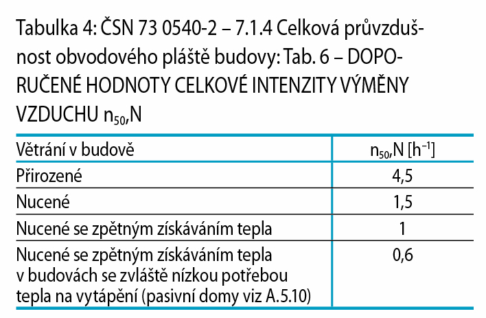 Vlastní provádění BLOWER DOOR TESTU je možné získat z literatury. Výsledek testu hovoří o tom, jak je dům těsný. Doporučené hodnoty vzduchotěsnosti dle ČSN jsou uvedeny v tabulce 4. Díky tomuto údaji jsme schopni spočítat, jaké množství přívodního vzduchu infiltrací nemáme pod kontrolou. Je to ale průměrná hodnota. Pokud bude venku bezvětří, bude infiltrace nižší než v případě, že bude foukat slabý nebo velmi silný vítr. Záleží také na tom, v jaké lokalitě bude dům postaven – jestli uprostřed zástavby nebo na „větrné hůrce“ nebo jestli je byt v přízemí nebo v desátém patře (s tímto se hlavně při dodávce oken při rekonstrukcích nijak nepočítá). I tyto skutečnosti jsou v normě ošetřeny pomocí stínicích a výškových koeficientů.Při dimenzování větrání známe požadavek na celkový přívod vzduchu do objektu. Ten musíme ponížit o množství přiváděné neřízeně, proto parametr vzduchotěsnosti a vliv lokality. Dostaneme hodnotu vzduchu, na kterou nastavíme VZT systém – vše proto, abychom pak neměli problém s nízkou relativní vlhkostí při převětrání interiéru.