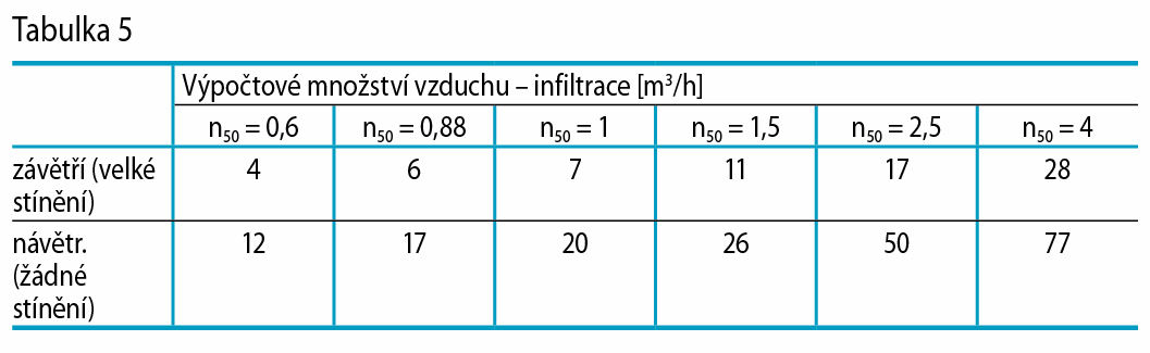 Pro porovnání jsme vzali opět dům EPD Rychnov. Z naměřených hodnot v provozu víme, že průměrně přivádíme množství vzduchu 23 m3/h a osobu, za den při průměrném obsazení pak 2200 m3. Objekt jsme umístili do lokality chráněné před větrem (tzv. velké zastínění) a do oblasti větrem exponované (žádné zastínění). Přiřadili jsme také hodnoty n50 dle doporučených parametrů, doplnili jsme hodnotu n50 naměřenou v EPD Rychnov a vzhledem ke grafickému výstupu i další. V tabulce 5 je vidět vzrůstající hodnotu infiltrace vzduchu ve vazbě na horší parametr vzduchotěsnost konstrukcí. Zajímavé je také porovnání lokality a skutečného množství vzduchu přijatého infiltrací. Objekt s horším parametrem n50 na tom je v závětří lépe než dokonaleji provedený objekt s nižší hodnotou n50 postavený „na větrné hůrce“.