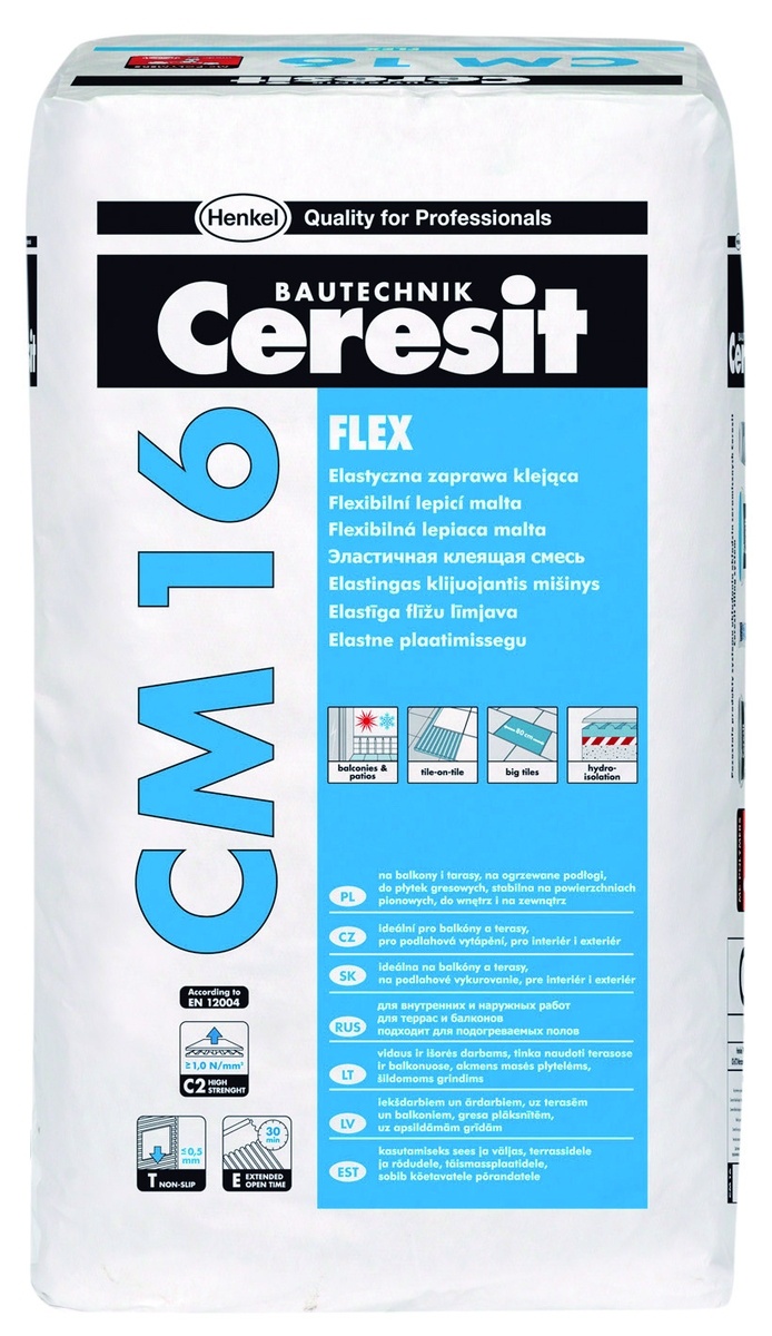 Možností lepit keramické obklady a dlažbu i na kritické podklady v interiéru se může pochlubit elastická malta Ceresit CM 12 – ELASTIC. Malta je ideální pro oblasti zatížené vlhkostí, tj. pro koupelny a kuchyně. Podkladem mohou být beton, cementové potěry, cementové i vápenocementové omítky, v interiéru sádrovláknité desky a sádrokartón, anhydrit, sádrové podklady, pórobeton, dřevotřísky, OSB desky, stávající obklady a dlažba. Malta je zařazena do třídy C1T a její přídržnost je vyšší než 0,5 N/mm2. Lepicí maltu Ceresit CM 12 PLUS – FLEX je možno použít i v exteriéru a při složitějších aplikacích, jako je například lepení obkladů a dlažby na balkónech a lodžiích. CM 12 Plus je zařazena do třídy C2T a její přídržnost je tedy vyšší než 1 N/mm2.