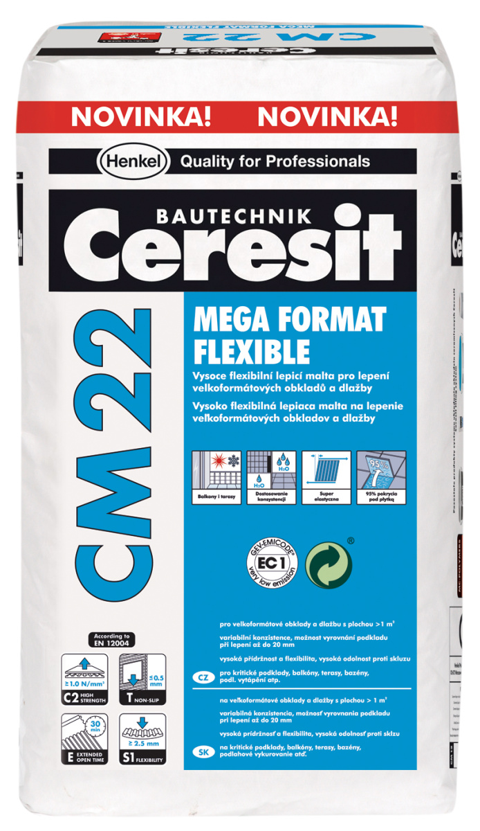 Pro lepení velkoformátových dlažeb je ideální vysoce flexibilní lepicí malta Ceresit CM 22 Mega Format Flexible. Vyznačuje se sníženým skluzem (T) a vysokou přídržností (C2) malty k podkladu, a to i při aplikaci na těsnicí hmoty a těsnicí malty. Tyto vlastnosti předurčují její použití pro lepení velkých a těžkých obkladových desek s plochou větší než 1 m2 na stěnách, bez nutnosti podpory lepených obkladů – malta zabraňuje skluzu desek způsobených jejich vlastní hmotností. Malta je určena pro použití v případě náročných podmínek a kritických podkladů na místech, jako jsou balkóny, terasy, bazény apod. Malta Ceresit CM 22 je zařazena do třídy C2 a splňuje požadavky na příčnou deformaci třídy S1.