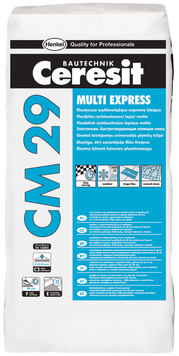 Díky rychlému vytvrzování je flexibilní lepicí malta Ceresit CM 29 Multi Express vhodná zejména pro opravy a rekonstrukce, při kterých je zvýšený nárok na rychlý postup prací. Doba pro zpracování této lepicí malty je přibližně jedna hodina. Extrémně krátká je doba, kdy je možné začít obklady a dlažby spárovat – nová lepicí malta je pochozí a umožňuje spárování již po cca 3 hodinách od nalepení dlažby. Nerovnosti podkladu do 20 mm je přitom možno vyrovnat přímo při lepení obkladů nebo dlažby samotnou lepicí maltou.