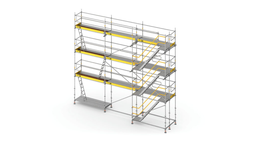 Schodiště PERI UP s šířkou 75 cm a výškou ramena 3 m s rychlou montáží nabízí velkou bezpečnost integrovanou v systému.