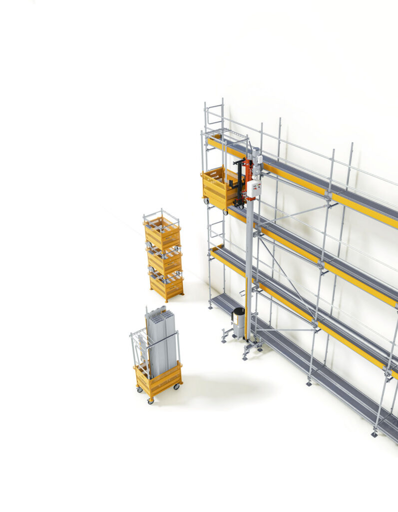 Systém pro přepravu lešení Alimak STS 300 byl vyvinut pro použití se stavebnicí lešení PERI UP. Zcela nová koncepce systému pro přepravu lešení pomáhá lešenáři při efektivní a bezpečné montáži a demontáži lešení PERI UP. Odnímatelné přepravní boxy systému Alimak STS 300 umožňují kromě vertikálního transportu na lešení také horizontální přepravu po zemi. Vždy je zaručena bezpečná nakládka a vykládka ve výšce i na zemi. Zatímco se dole nakládá materiál do nového přepravního boxu, nahoře mohou montážní práce plynule pokračovat.