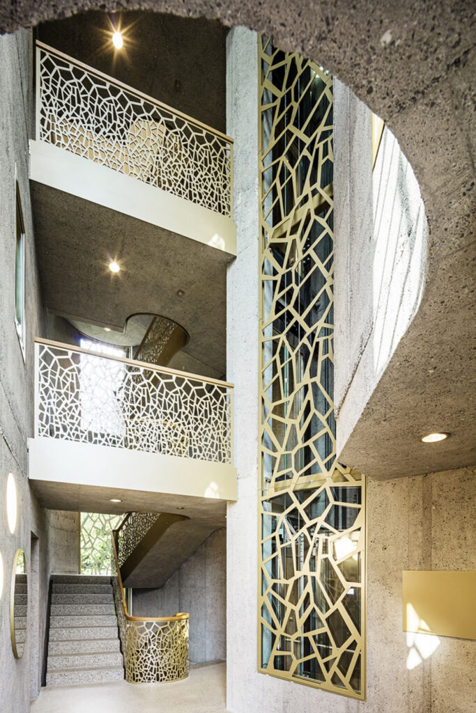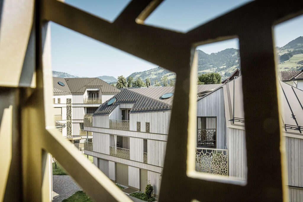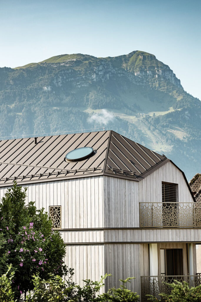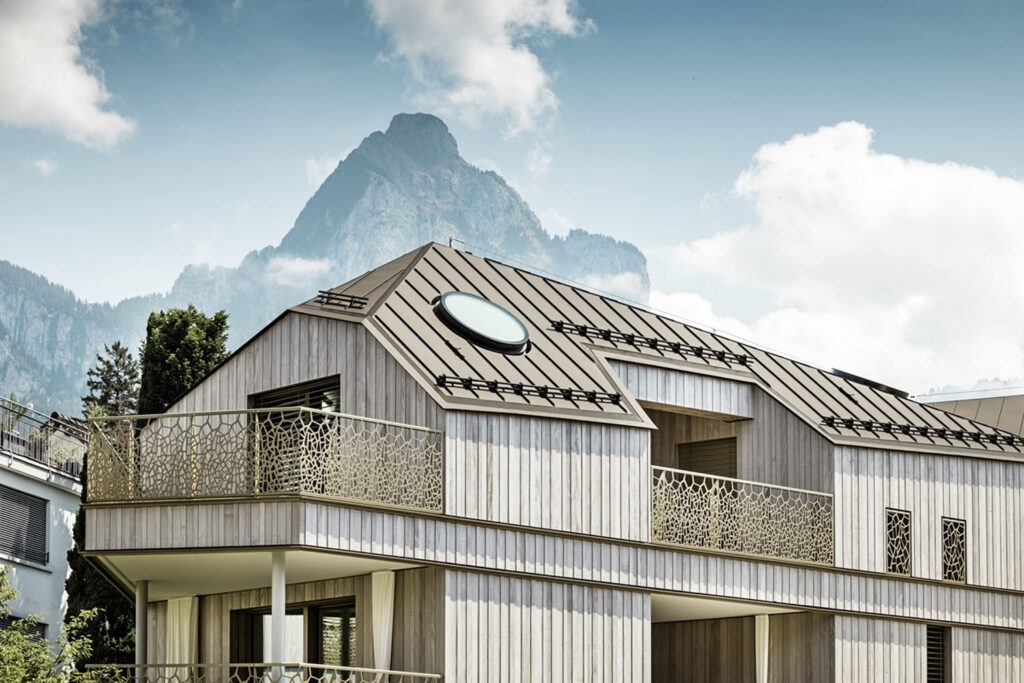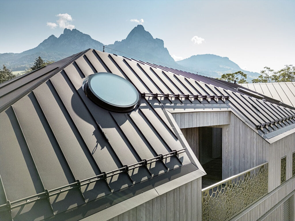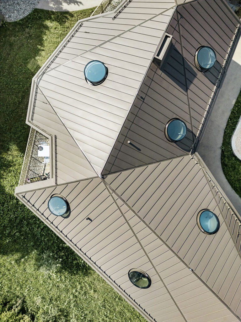Střešní krytina PREFALZ, zvolená pro všechny budovy, zajišťuje maximální odolnost proti nepříznivým povětrnostním vlivům alpské oblasti, jako jsou vichřice, bouřky či extrémní teplotní rozdíly. Tento hliníkový materiál vyniká nejen svou lehkostí a životností, ale i možností přizpůsobit se složitým geometrickým tvarům střech.