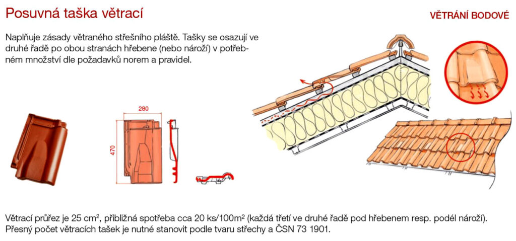 – V oblasti hřebene jsou ve druhé řadě od hřebene umístěny větrací tašky v celkovém počtu 18 ks. Podél nároží větrací tašky chybí.