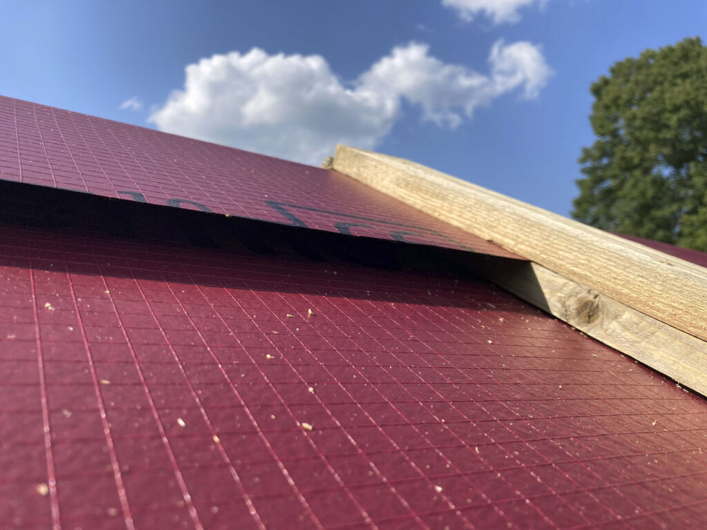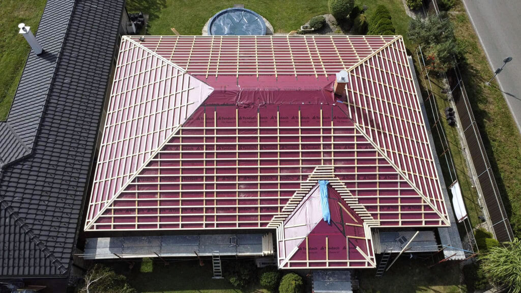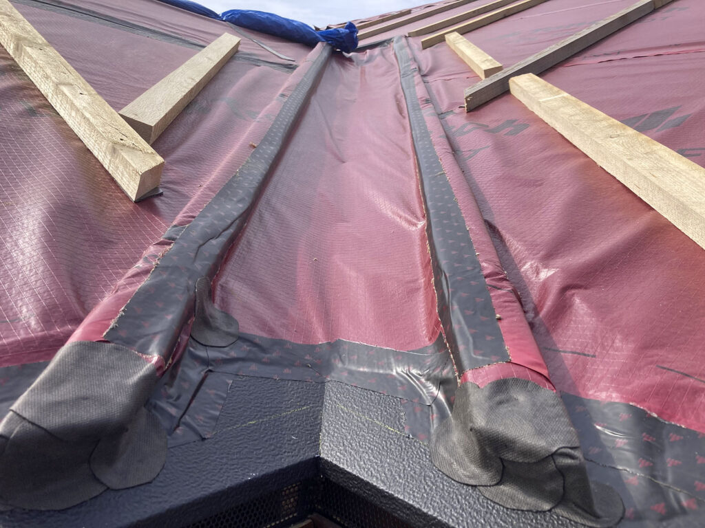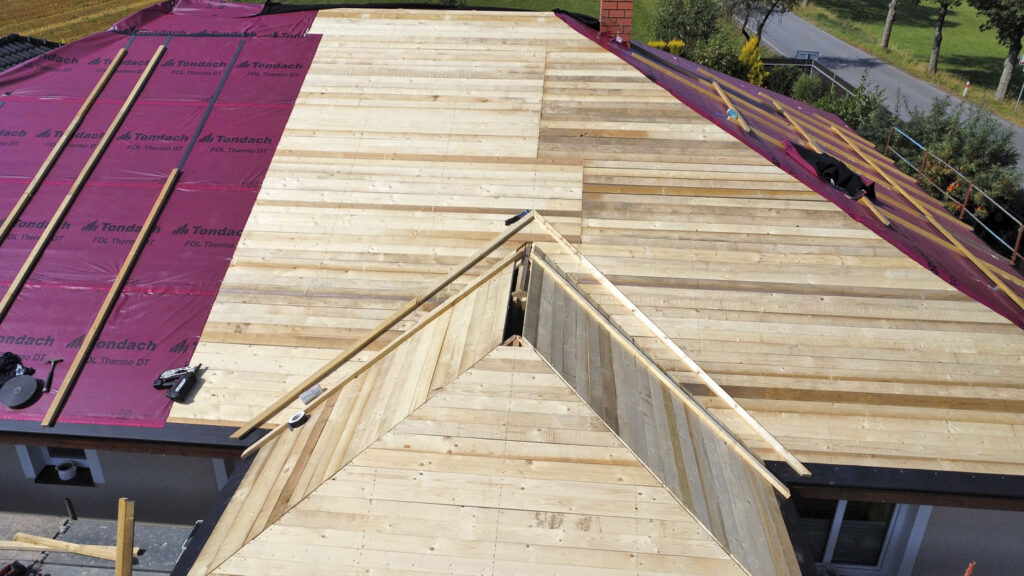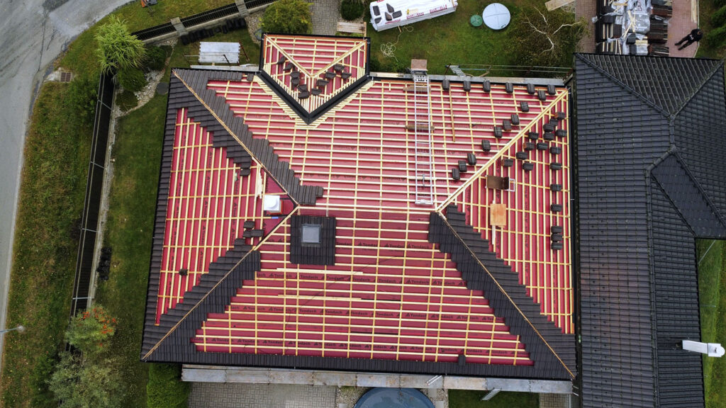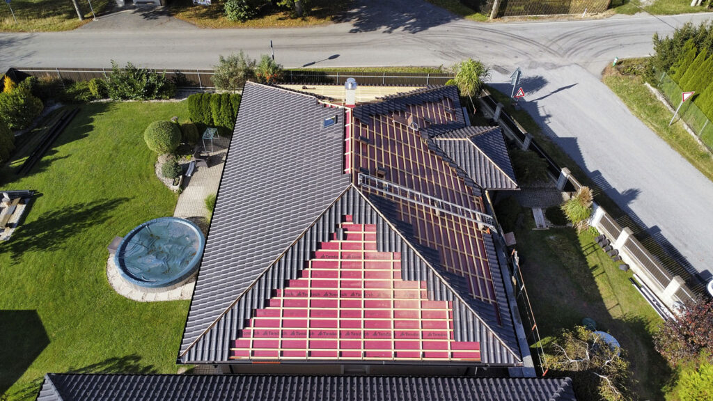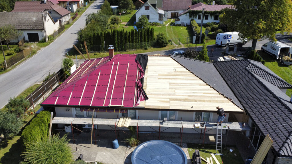 Na střeše je nově prkenný záklop, správný typ fólie TONDACH FOL THERMO DT s přelepenými přesahy a s podtěsněnými kontralatěmi.