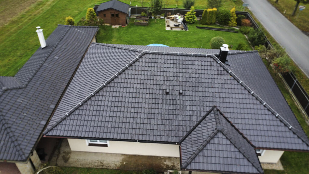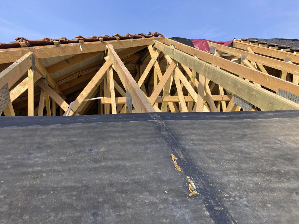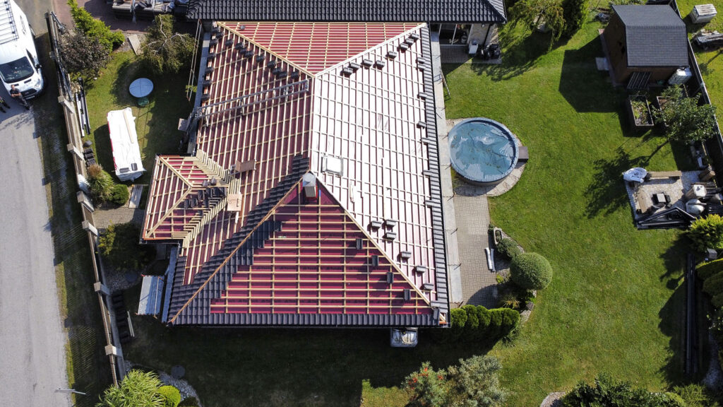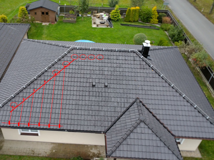 – Střecha rodinného domu, který je první stavbou v obci, je valbová s jedním vikýřem a sklonem 23°. Střešní krytina je tvořena pálenými taškami Samba 11 s engobovaným povrchem v černé barvě. Ty jsou uloženy na latích a kontralatích o průřezu 2,6 × 4,5 cm. Dále je použita difuzní fólie, která je volně napnutá, avšak chybí její popis, přelepení přesahů a podtěsnění kontralatí. Strop nad obytnou částí je zateplen minerální izolací, pod kterou se nachází parotěsná fólie a sádrokartonový podhled.