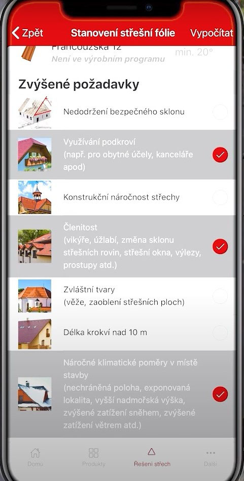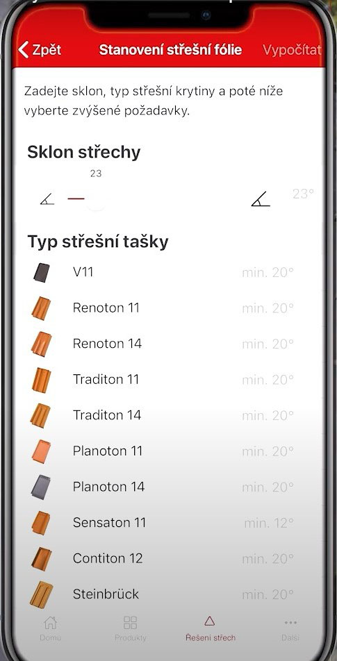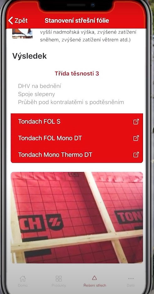 Pro rychlejší určení třídy těsnosti DHV je vhodné využít program, který je součástí Mobilní technické příručky TONDACH. Zadáním sklonu střechy, typu tašky a počtu zvýšených požadavků lze pomocí tohoto programu snadno zjistit požadovanou třídu těsnosti.