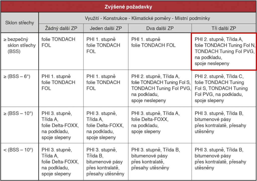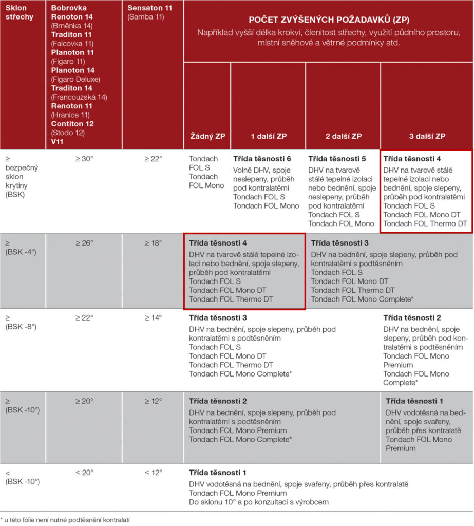 Definice třídy těsnosti 4 nám přesně říká, jaká lze použít minimální opatření při dodržení bezpečného sklonu. Na střechu nepůsobí více jak tři zvýšené požadavky. Je tedy nutné použít minimálně DHV třídy těsnosti 3, tedy přísnější požadavky: