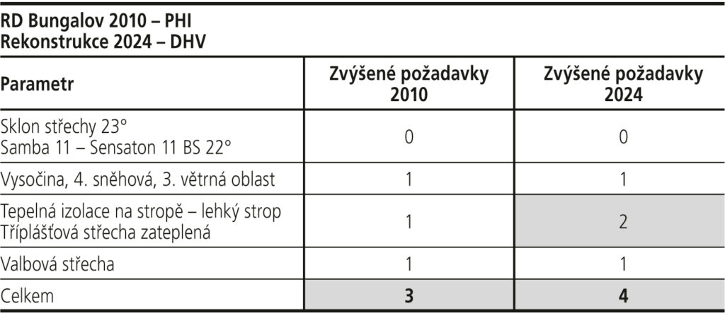 Protože střecha nebyla provedena ani v souladu s tehdejšími podmínkami z roku 2010, bylo nutné ji kompletně rekonstruovat a posoudit podle aktuálních norem a pravidel, konkrétně podle normy ČSN 73 1901 z roku 2020 a Pravidel pro navrhování a provádění střech z roku 2014. Změna se netýkala pouze terminologie, kdy byl termín „pojistná hydroizolace“ (PHI) nahrazen termínem „doplňková hydroizolační vrstva“ (DHV), ale také zpřísnění kritérií. Použití tepelné izolace v konstrukci střechy je nyní automaticky považováno za navýšení na dva zvýšené požadavky (viz tabulka č. 3).
