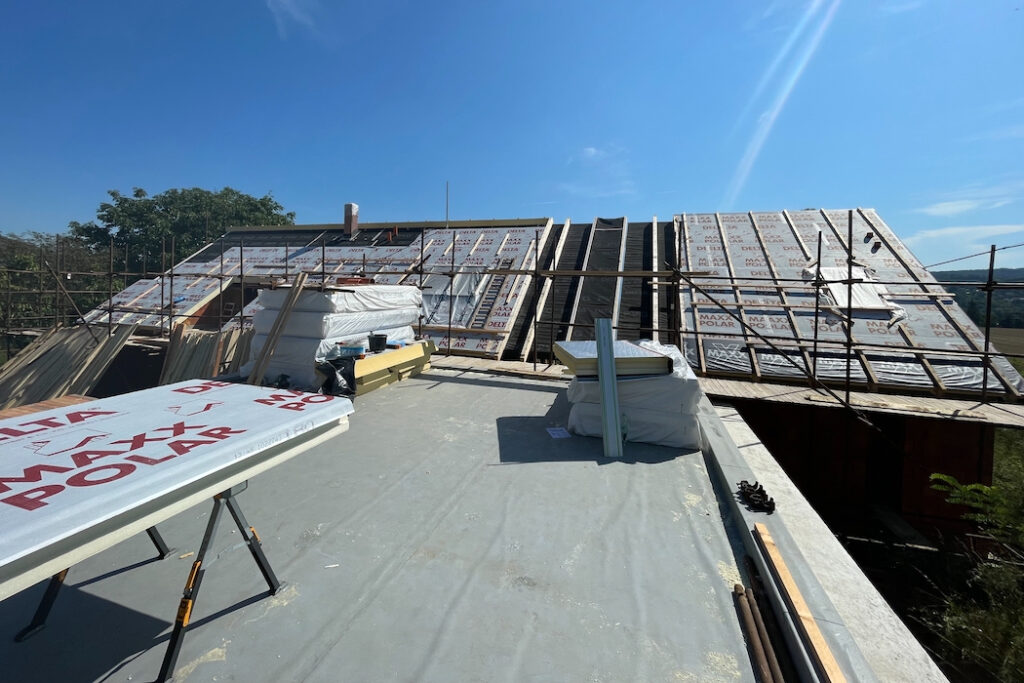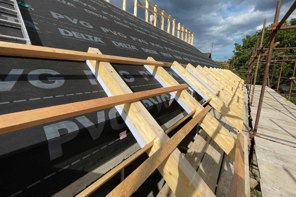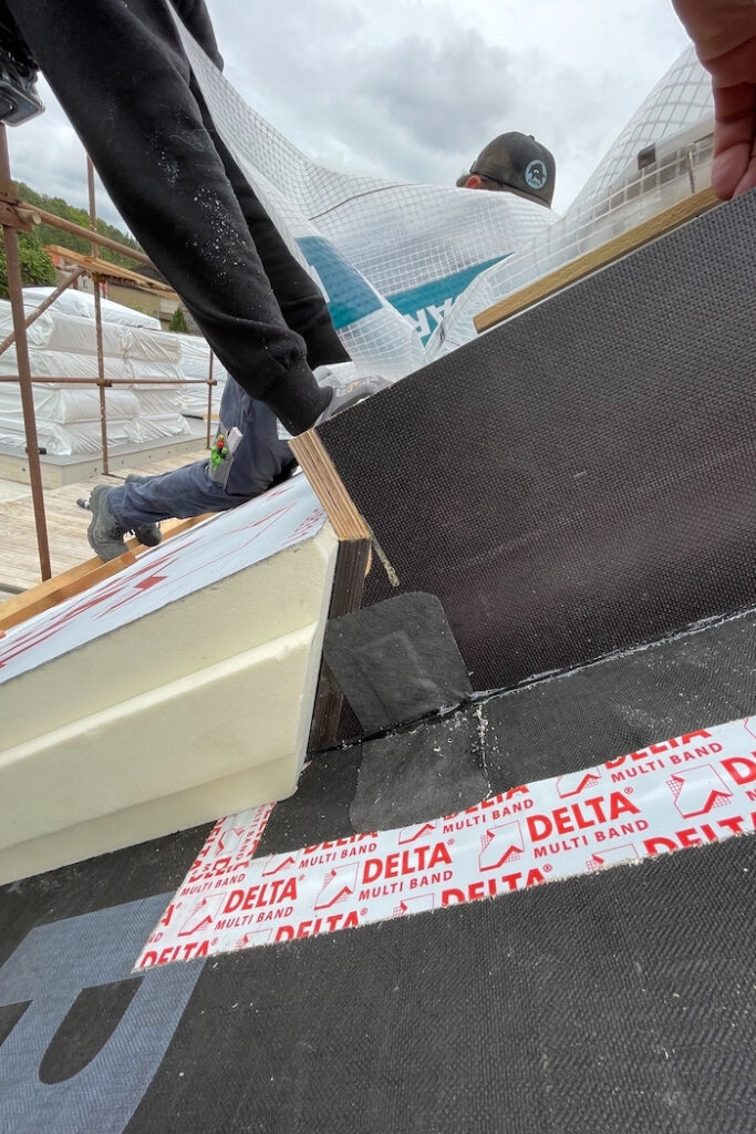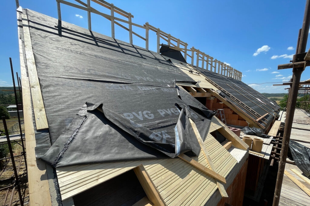 Druhou stránkou mince je ovšem provedení. Pro pokládku desek je potřeba vytvořit ideální podmínky, střechu tvarově přizpůsobit tak, aby se veškeré detaily vyřešily co nejkomfortněji a z hlediska funkčnosti spolehlivě. Zásadní je návrh střechy bez zbytečných tvarových komplikací, pak je pokládka desek maximálně efektivní. Proto jsou vítány střechy jednoduchých tvarů – například sedlové, bez krokevních přesahů. Pokud jsou krokevní přesahy požadovány, doporučuje se je vytvořit pomocí dodatečně kotvených krokevních námětků. Proč? Zásadou číslo jedna je vzduchotěsné provedení parozábrany ve všech spojích a napojení, s napojením na veškeré přilehlé stavební konstrukce a konstrukční prostupy ještě před samotnou pokládkou desek. Ke správnému provedení je potřeba instalovat bednění (záklop). Cenu tohoto deskového zateplovacího systému kompenzujeme tím, že v případě pohledového bednění a krokevních prvků ze strany interiéru máme vlastně hotovo, bez dalších investic do konstrukčně náročných podhledových vrstev. V opačném případě musíme počítat s vyššími náklady dle rozsahu prací spojených s dodatečně aplikovaným podhledem.