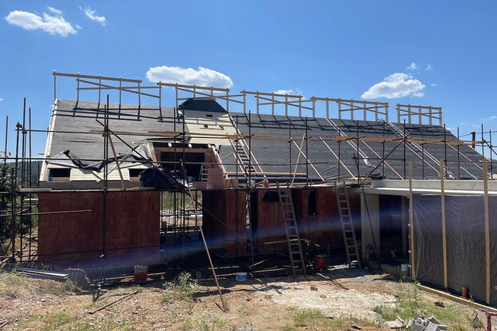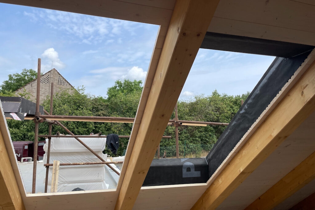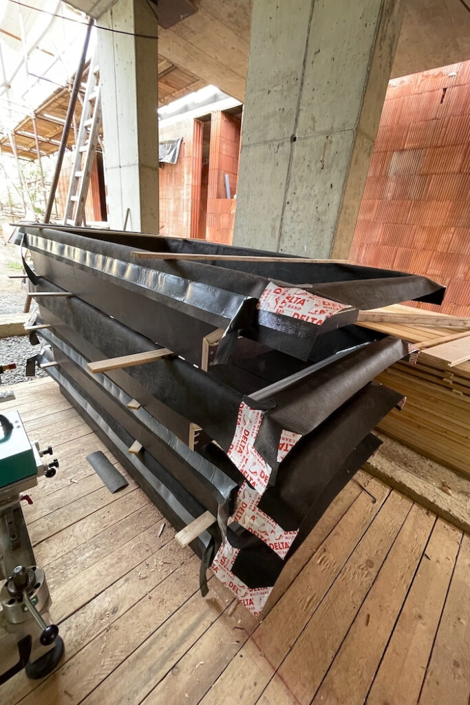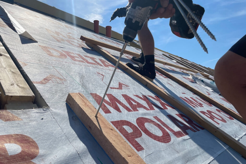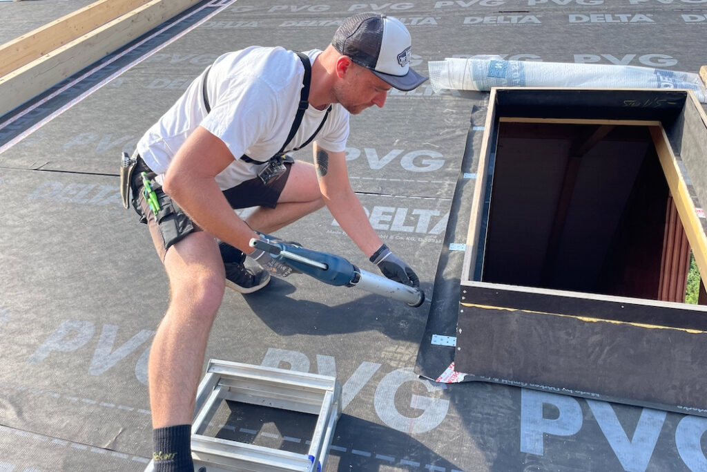 Druhou stránkou mince je ovšem provedení. Pro pokládku desek je potřeba vytvořit ideální podmínky, střechu tvarově přizpůsobit tak, aby se veškeré detaily vyřešily co nejkomfortněji a z hlediska funkčnosti spolehlivě. Zásadní je návrh střechy bez zbytečných tvarových komplikací, pak je pokládka desek maximálně efektivní. Proto jsou vítány střechy jednoduchých tvarů – například sedlové, bez krokevních přesahů. Pokud jsou krokevní přesahy požadovány, doporučuje se je vytvořit pomocí dodatečně kotvených krokevních námětků. Proč? Zásadou číslo jedna je vzduchotěsné provedení parozábrany ve všech spojích a napojení, s napojením na veškeré přilehlé stavební konstrukce a konstrukční prostupy ještě před samotnou pokládkou desek. Ke správnému provedení je potřeba instalovat bednění (záklop). Cenu tohoto deskového zateplovacího systému kompenzujeme tím, že v případě pohledového bednění a krokevních prvků ze strany interiéru máme vlastně hotovo, bez dalších investic do konstrukčně náročných podhledových vrstev. V opačném případě musíme počítat s vyššími náklady dle rozsahu prací spojených s dodatečně aplikovaným podhledem.