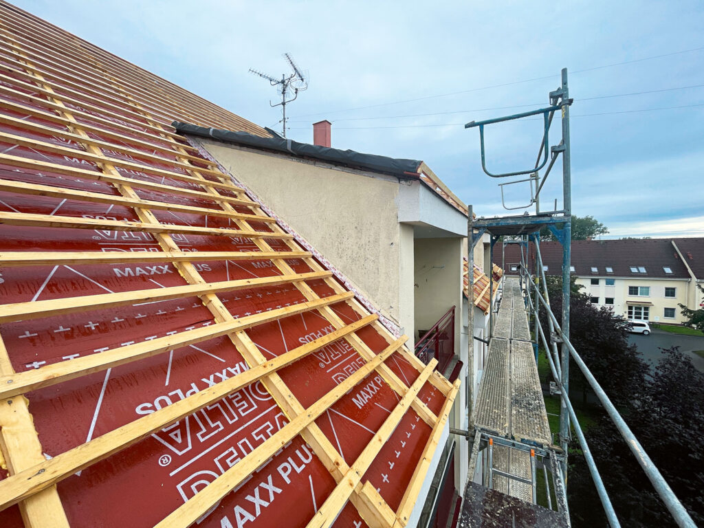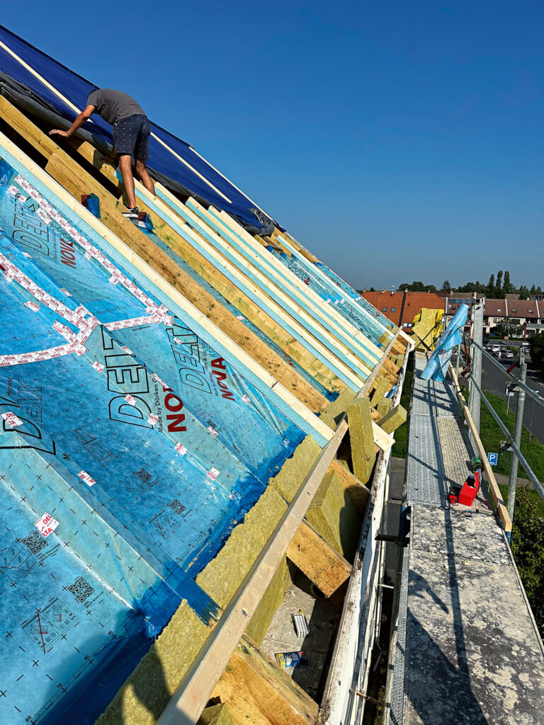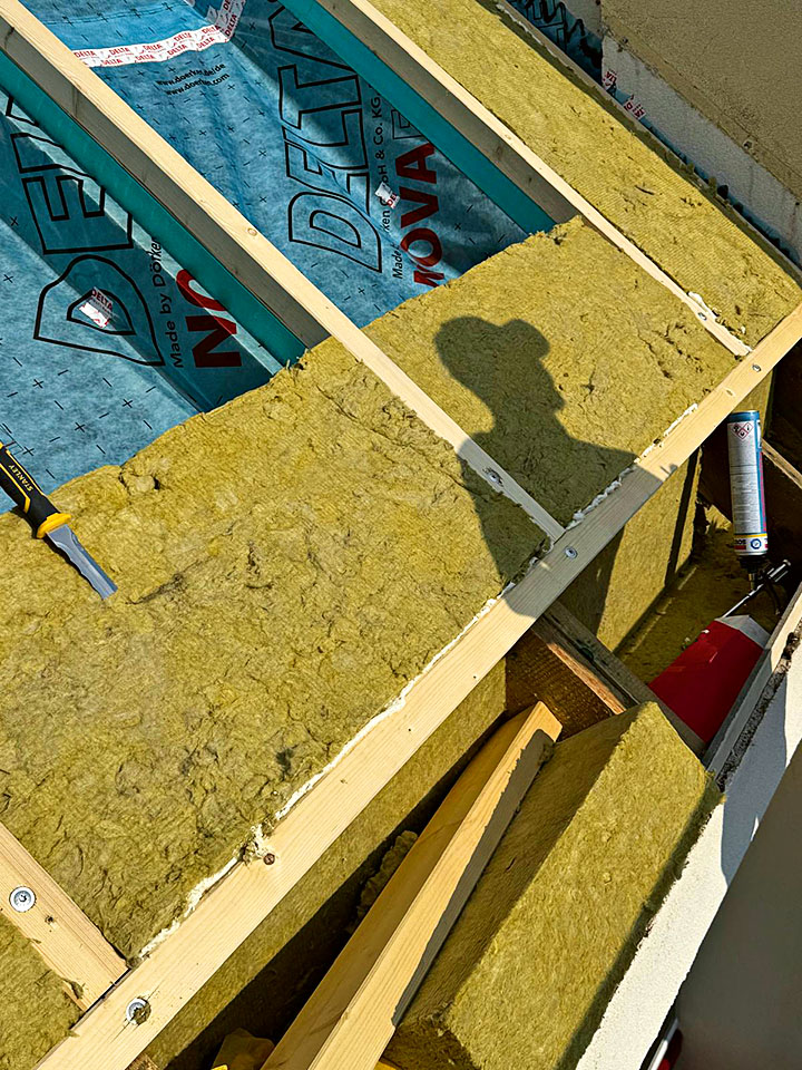 Po instalaci vzduchotěsně zpracované sanační parobrzdy DELTA-NOVAFLEXX následuje vyplnění prostoru mezi krokvemi tvarově stabilním tepelným izolantem. V případě, že výška krokví nepostačuje pro požadovaný tepelný odpor, jsou krokve nastaveny pomocí námětek z XPS 300. Toto řešení zároveň snižuje riziko tepelných mostů. Námětky jsou z vrchní strany bezpečně připevněny ke krovu pomocí vrutů a dřevěných hranolů.