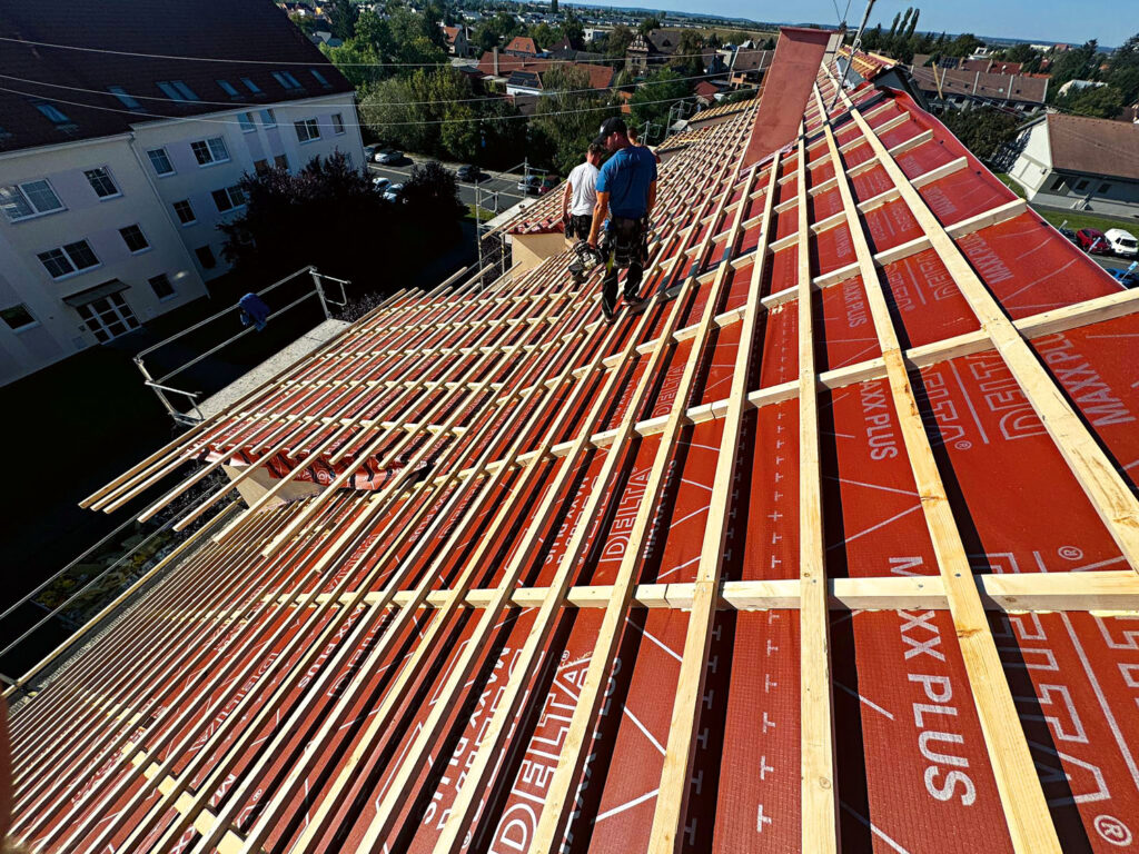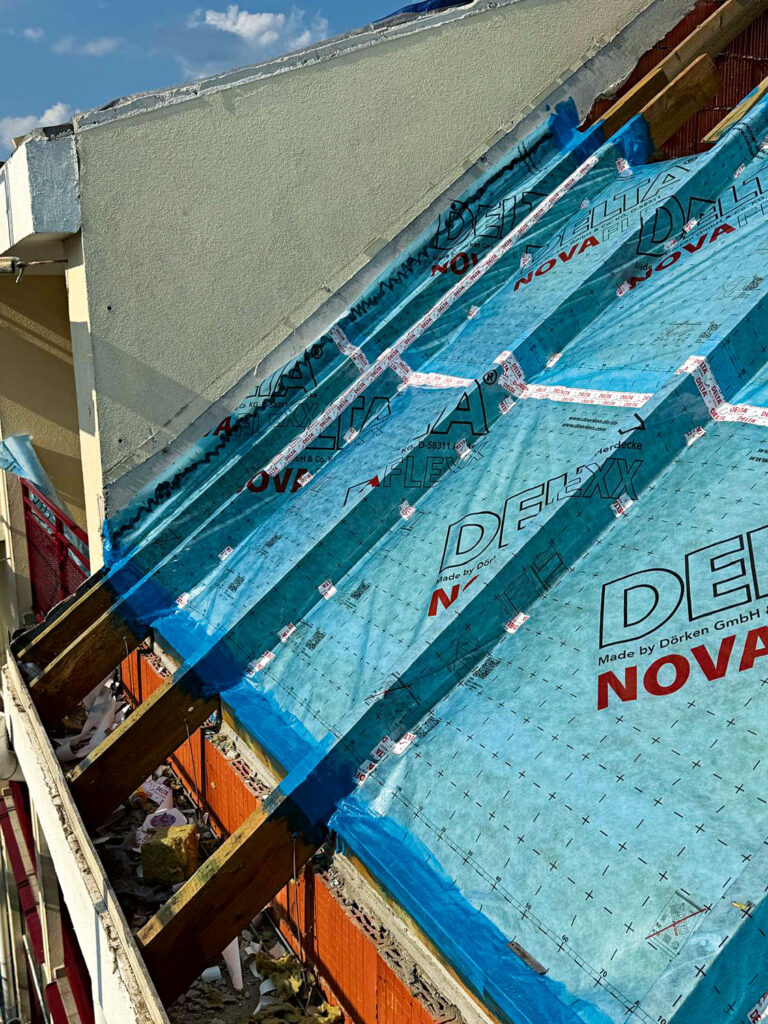 Provedené zateplení je následně chráněno pojistnou hydroizolací, v tomto případě DELTA-MAXX PLUS, která může při správném zpracování dočasně nahradit střešní krytinu po dobu až 6 týdnů.