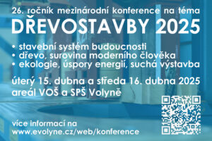 Stavební systém budoucnosti – dřevo, surovina moderního člověka V úterý 15. dubna 2025 a ve středu 16. dubna 2025 proběhne na VOŠ Volyně XXVI. ročník mezinárodní odborné konference “Dřevostavby”. Pro letošní ročník je připraveno 36 přednášek, se kterými vystoupí přední odborníci z výrobní a projekční sféry ze Slovenska, Rakouska, Německa, Finska, Francie, […]