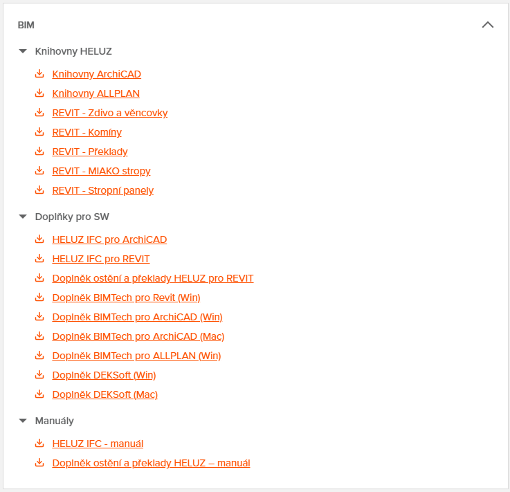 Mezi technické podklady v tomto smyslu řadíme minimálně BIM knihovny a doplňky pro BIM SW (HELUZ IFC, doplněk HELUZ pro REVIT, BIMTech Tools, …). Použití těchto podkladů nám zaručí detekci veškerých materiálů, které jsou součástí výkazu výměr (zdivo, překlady, stropní konstrukce, komíny, …).