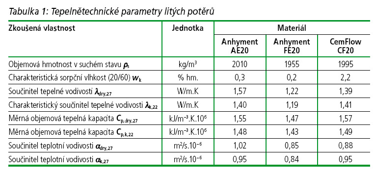 Tepelnětechnické parametry litých potěrů Jak již bylo zmíněno výše, použití monolitických potěrových vrstev v podlahových konstrukcích zlepšuje akumulační schopnost dřevostavby a pomáhá stabilizovat teplotu v interiérech, zejména mimo topnou sezónu v období velkých výkyvů teplot ve dne a v noci. Pro umožnění tepelnětechnických výpočtů bylo společností TBG Pražské malty zorganizováno měření základních tepelnětechnických parametrů materiálů Anhyment AE20, Anhyment FE20 a CemFlow CF20. Jedná se o potěry na bázi síranu vápenatého (Anhyment), konkrétně AE – Anhydrit a FE alfa- -sádra a potěr na bázi cementu CF.