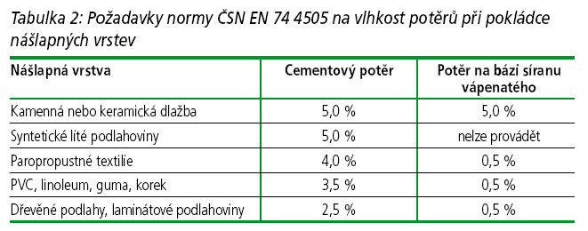 Rychlost vysychání litých potěrů Jednou z výhod dřevostaveb je velká rychlost jejich výstavby. Použitím litého potěru zabudováváme do podlahové konstrukce určité množství technologické vody, která před pokládkou nášlapných vrstev musí vyschnout. Je tedy potřeba, aby použití monolitických podlahových vrstev výrazně nezpomalilo výstavbu. Potřebnou míru vyschnutí potěru udává buď norma ČSN 74 4505, nebo technický list použité nášlapné vrstvy. Maximální vlhkost potěru pro konkrétní nášlapné vrstvy se liší i dle typu pojiva v potěru. Požadavky na maximální vlhkost jsou pro potěry na bázi síranu vápenatého výrazně přísnější než pro potěry cementové. Spolu s vyšším množstvím technologické vody v čerstvé lité směsi to na jednu stranu znamená delší dobu vysychání potěru na bázi síranu vápenatého než potěru cementového. Na druhou stranu se potěry na bázi síranu vápenatého (Anhyment) používají už od tloušťky 30 mm, kdežto cementové potěry CemFlow až od 40 mm, což mírně prodlužuje naopak vysychání cementových potěrů. Požadované maximální vlhkosti dle ČSN 74 4505 jsou uvedeny v následující tabulce 2.