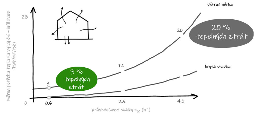 Průvzdušnost obálky má vliv na energetickou náročnost budovy, kdy každý 1 m³/h netěsně unikajícího vzduchu může představovat až 30 W tepelných ztrát, v závislosti na teplotním rozdílu mezi interiérem a exteriérem. U budov s vysokou vzduchotěsností, typicky s hodnotou n50 ≤ 0,6 h-¹, je infiltrace vzduchu minimalizována, a i při vyšších rychlostech větru zůstávají tepelné ztráty způsobené nekontrolovaným prouděním vzduchu nízké. Starší nebo netěsné budovy s vyšší hodnotou n50, například ≥ 5 h-¹, jsou náchylnější k infiltraci vzduchu. Při rychlosti větru 6 m/s mohou tepelné ztráty vzrůst až o 20 % ve srovnání s bezvětřím. To vede k vyšší spotřebě energie na vytápění a snížení komfortu obyvatel. U netěsné budovy mohou nekontrolované tepelné ztráty tvořit 10–30 % celkových tepelných ztrát, zatímco u vzduchotěsné budovy je tento podíl minimální. Běžná budova s přirozeným větráním s hodnotou n50 = 4,5 h-1 má roční ztráty infiltrací kolem 26 kWh/m²a, což je více než 1,5násobek měrné potřeby tepla na vytápění u pasivních domů. Je zřejmé, že zabezpečení neprůvzdušnosti je nutno věnovat náležitou pozornost i u renovací.