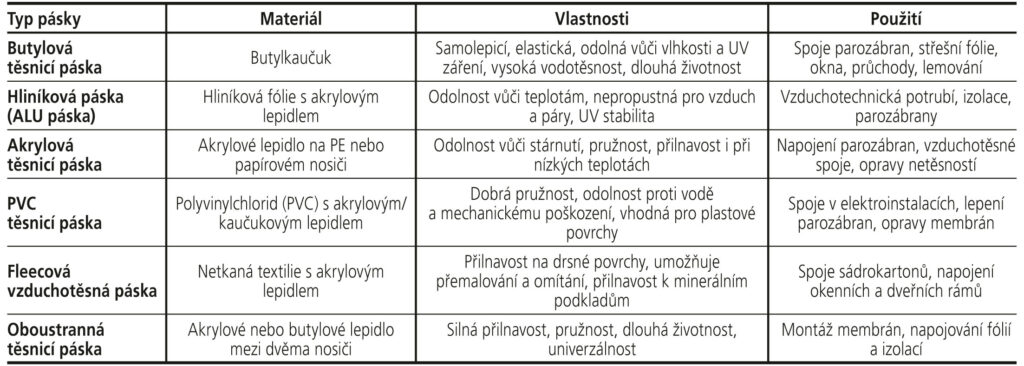 V neposlední řadě nejsou všechny lepicí pásky stejné, existuje značný výběr speciálních výrobků pro lepení, napojování a utěsňování. Rozličné vyhotovení těsnicích materiálů umožňuje výrazně urychlit a zjednodušit utěsňování stavby. Důležité je však zvážit vhodnost jejich využití. Některé materiály mohou totiž vzájemně chemicky reagovat, popřípadě nevytvářejí trvale těsné spoje. Při používání těsnicích materiálů je zapotřebí řídit se montážními postupy doporučenými výrobcem, případně se s ním přímo poradit.