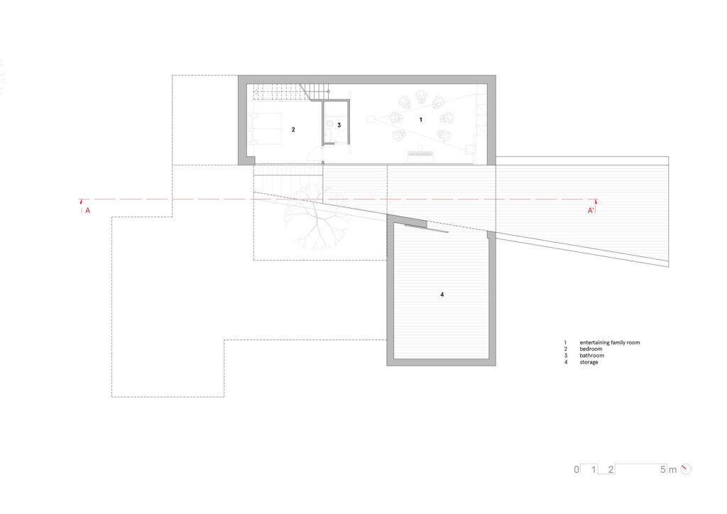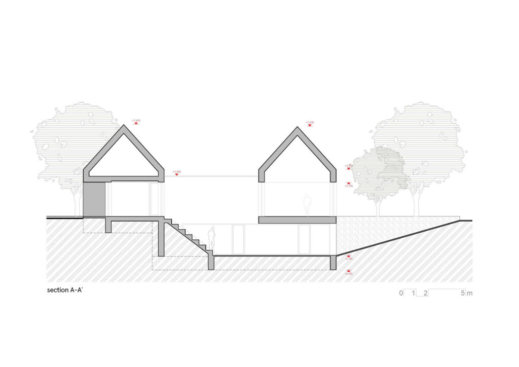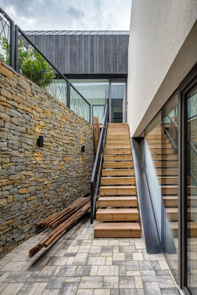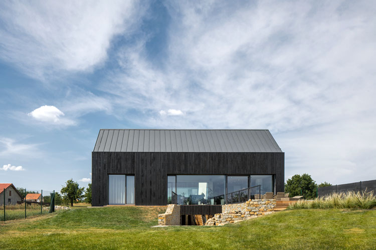 V exteriéru se ke slovu dostávají dva základní materiály – sedlové hmoty jsou opláštěny opalovaným dřevem a zastřešeny plechovou krytinou, doplňující kvádry mají bílou omítku. Pod domem je vytvořen terénní zádlab, který propojuje vnitřní atrium se zahradou. Zároveň se do tohoto prostoru otevírají polosuterénní herna a hudebna.