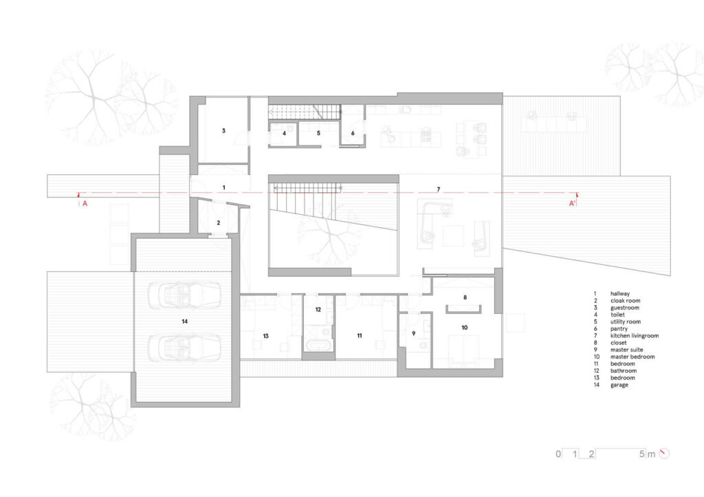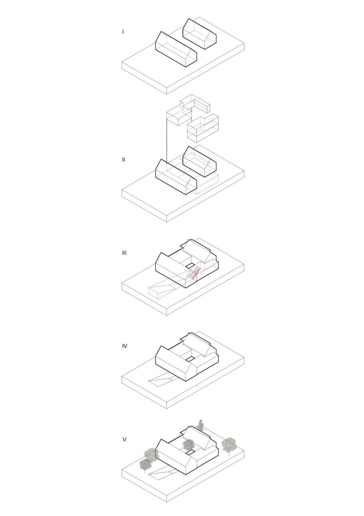 Dům definují dvě hmoty v černé barvě. Vytvářejí prostor atria, které vymezují jednoduché bílé kvádry. Vznikla tak uzavřená kompaktní stavba, odkazující k tradiční venkovské architektuře a stavením, která mají vnitřní dvůr mezi obytným domem a stodolou nebo dalšími hospodářskými budovami.