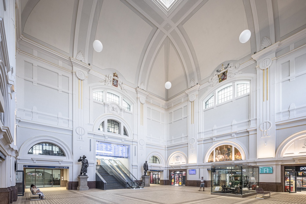 Ateliér A8000 přistoupil k proměně interiéru historického nádraží sebevědomě, ale s respektem k původnímu domu. Došlo tak například ke změně barevnosti. Nově tak interiéru, stejně jako tomu bylo před padesáti lety, vévodí citlivé a nerušivé šedé, bílé a krémové odstíny. Nádraží tím změnilo výraz a získalo ztracenou noblesu. Interiér doplnil odolný sedací nábytek z litého materiálu jako je corian. Dlažba je provedena jako replika původní historické dlažby.