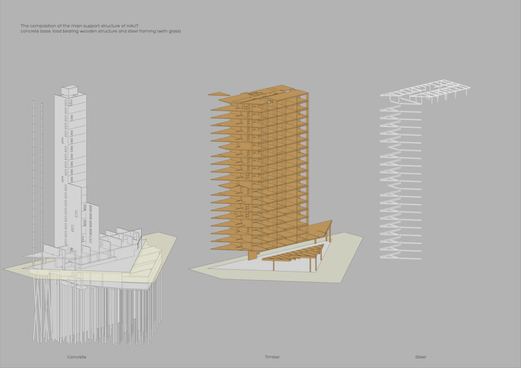 Čím více dřeva tedy bude stavebnictví využívat, tím méně emisí vyprodukuje. Studio Team V proto razí jednoduché heslo: Dřevo využívat tam, kde je to možné, ocel nebo beton pouze tam, kde je to nutné. Se stejnou filozofií byl postaven i Haut.