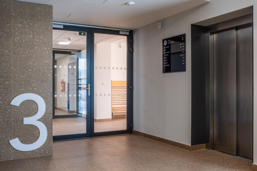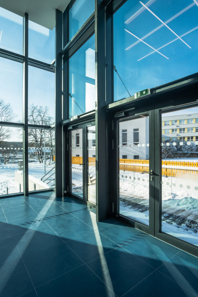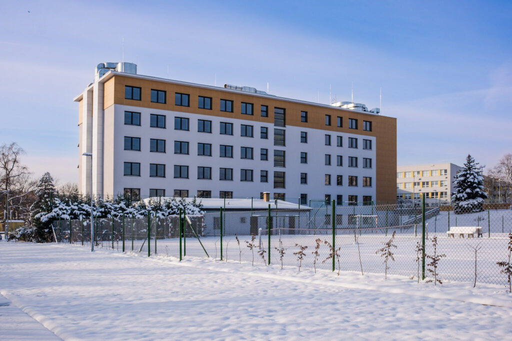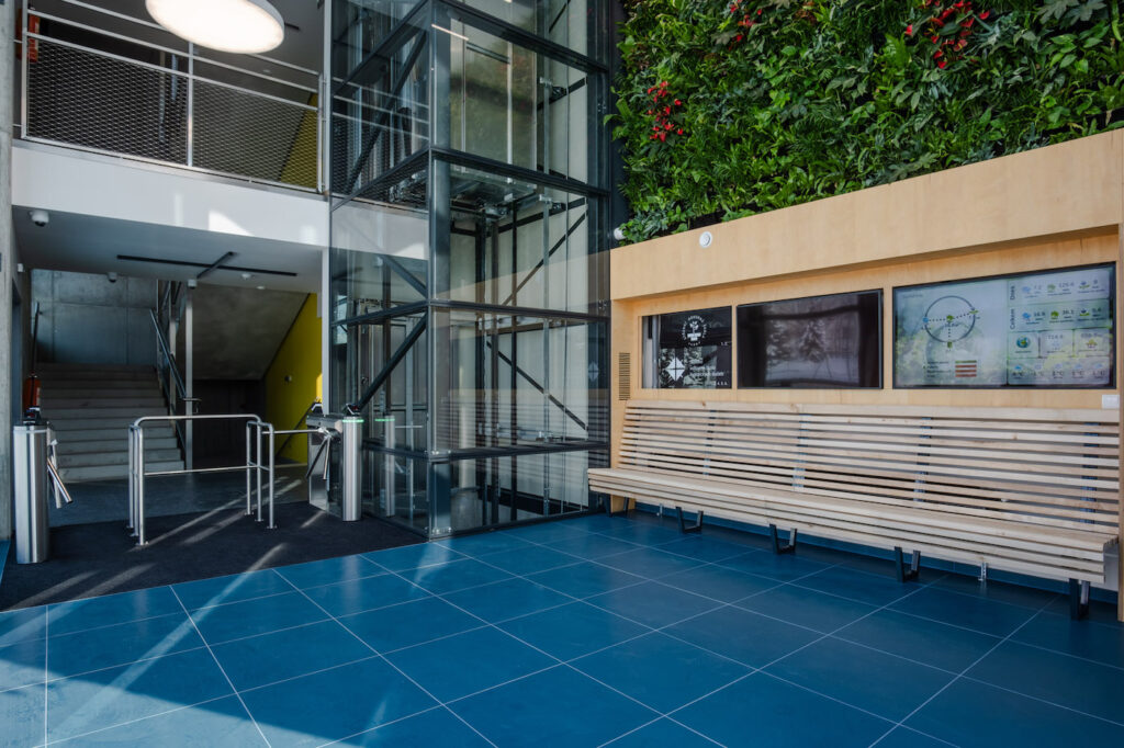 Přes třicet let stará budova si vyžádala kompletní zateplení střešního pláště a fasád. Okna ve všech patrech byla osazena trojskly s vyšším stupněm zvukové izolace. V rámci úspory vody došlo i k úpravě okapové soustavy, která nově zajišťuje akumulaci dešťové vody do dvou rozměrných nádrží o objemu 24 m3. Provoz počítá s využíváním zachycené vody k zavlažování okolních venkovních ploch a přilehlé zeleně. O kompletní vytápění vnitřních prostor se starají tři výkonná tepelná čerpadla napojená na 18 geotermálních vrtů sahajících do hloubky 150 m. Celkové energetické úspoře objektu výrazně přispívá důmyslný fotovoltaický systém.