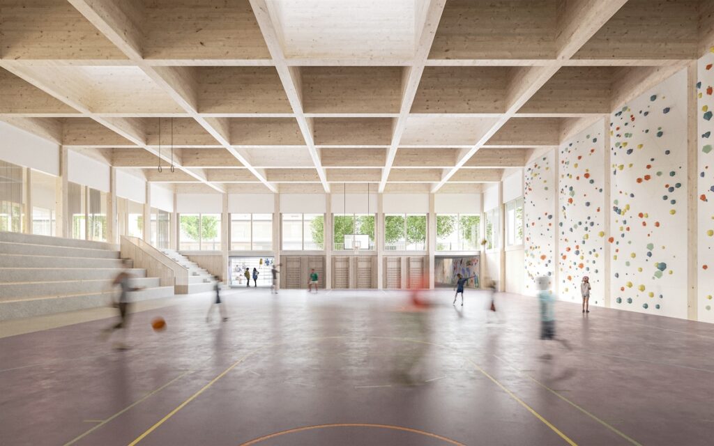 Třetí kubus, se stejným půdorysným rozměrem, představuje polo-zapuštěná hmota tělocvičny. Opakováním stejného rozměru v kompozici objemů vzniká volný prostor školního nádvoří s amfiteátrem.