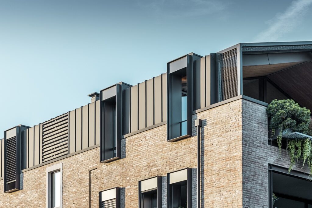 Dříve administrativní budova, která byla dlouhá léta opuštěná, získala novou přístavbu a dostala druhý život. Celková užitná plocha nyní činí 700 m² a nabízí kvalitní obytné i komerční prostory. Původní cihlová fasáda byla očištěna a zachována jako historický odkaz, zatímco nová část stavby byla obložena hliníkovým plechem PREFALZ v odstínu P. 10 oříšková, který podtrhuje kontrast mezi minulostí a současností. Elegantní tmavý povrch, provedený s důrazem na detail, doplňují přesně rytmizované stojaté drážky a přirozeně přechází z fasádní do střešní roviny – architektonický přístup, v němž hraje každá linie klíčovou roli.