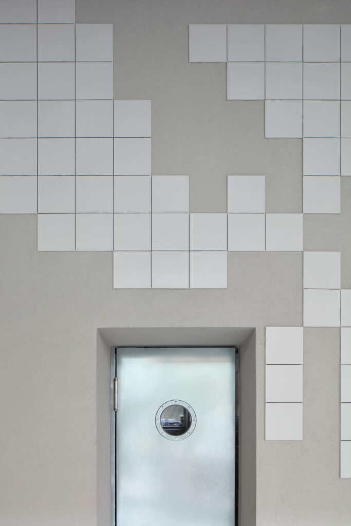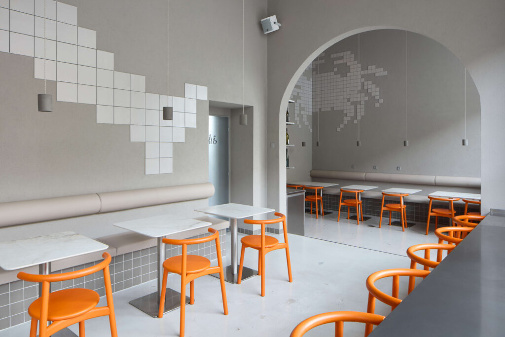 Interiér je postavený na ladění neutrálních tónů a akcentu tmavě oranžové, připomínající barvu raka. Autoři rekonstrukce předvedli dokonalou kreativní práci se základním čtvercovým formátem keramické dlažby, ukázali, jak je možné s ním v prostoru vytvořit až umělecky působící prvek! „Architekti sem vymysleli barevné židle, které nádherně kontrastují s šedým prostorem a vnášejí do něj výraznou energii. Nejgeniálnějším nápadem jsou jednoznačně dvě mozaiky raka a kraba poskládané z keramických dlaždic. Vypadají fantasticky, neruší, zároveň skvěle doplňují velké plochy stěn,“ chválí Patrik Yeranyan a David Neuhäusl vysvětluje: „Nejdřív jsme vybrali vhodné siluety raka a kraba, které jsme na počítači rozpixelovali. K vytvoření nástěnných motivů jsme (už poněkolikáté) použili námi oblíbené dlaždice české značky RAKO. V tomto případě konkrétně sérii Color Two s matným povrchem, pracovali jsme se dvěma formáty dlaždic – 10 x 10 a 20 x 20 centimetrů. Předem jsme připravili i spárořezy. Na svislé plochy, na míru vyrobených dlouhých sedacích lavic a také soklů, jsme použili tmavě šedý odstín čtvercového formátu 10 x 10 centimetrů ze stejné kolekce.“