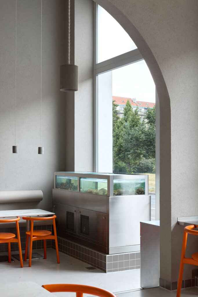 Desítky let se tu pralo a čistilo. V roce 1967 bylo totiž přízemí dejvického činžovního domu z 30. let 20. století zkolaudované pro provoz rychločistírny. Dnes si ve stejném nedávno kompletně předělaném interiéru pochutnáte na neobyčejných jídlech připravených z mořských i sladkovodních živočichů a ryb. Navíc budete mít při odchodu jasno, jaký je rozdíl mezi rakem a krabem. A to nejenom díky nevšední gastronomické nabídce. Podlouhlou dispozici, původně rozdělenou na tři menší místnosti, snižoval podhled. Prostor po vyčištění a odstranění většiny dělicích konstrukcí získal nejenom celistvou plochu, ale také výšku. Autoři rekonstrukce s mírnou nadsázkou dodávají, že místnost má nyní až chrámový charakter. „Odstranění podhledů a propojení místností podél uliční fasády přineslo dovnitř víc světla. Nový výsuvný výkladec pak posílil kontakt s exteriérem. Přesto jsme tu využili maximum toho, co zůstalo. Například jsme zachovali oblouk stěny a o dva schody sníženou podlahu na konci prostoru, kde je kromě jídelního koutu umístěné akvárium,“ zmiňuje architekt David Neuhäusl z ateliéru Neuhäusl Hunal.