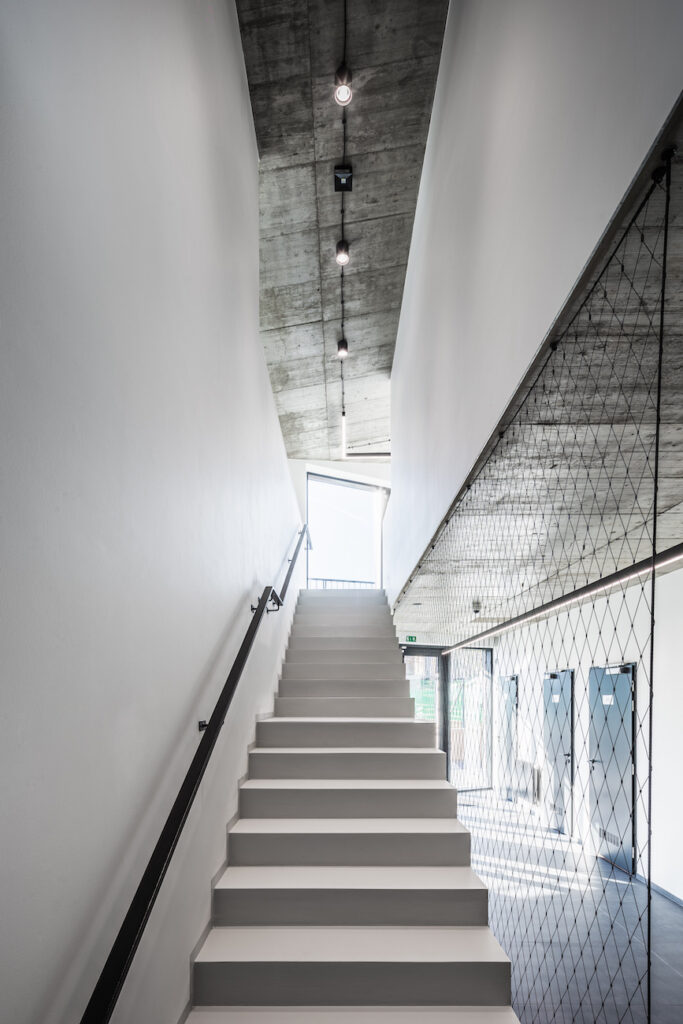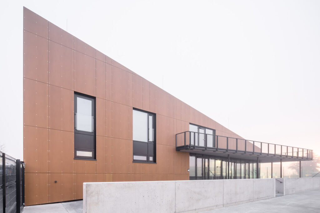 Kompaktnost stavby je podtržena jednotným materiálovým řešením vnějšího pláště. Všechny fasády i střešní rovina jsou totiž provedeny systémem provětrávané dvouplášťové skladby s fasádními čedičovými deskami Rockpanel natural jako s pohledovou vnější vrstvou. Jedná se o unikátní řešení, desky z tvrzeného čediče nebyly pro obklad konstrukce střešního pláště dosud nikde použity. Vzniká tím jedinečná pohledová střešní krajina, která nijak neruší, jen minimalisticky zapadá do celého areálu.
